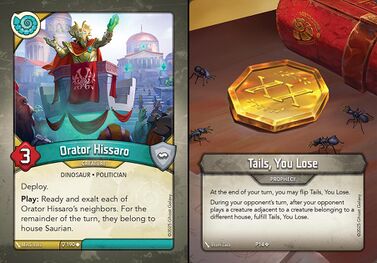 - If I play Orator Hissaro between two non-Saurian creatures, could I choose to resolve Hissaro's Play: ability first to make his neighbors belong to Saurian so I can avoid fulfilling my opponent's Tails, You Lose prophecy?